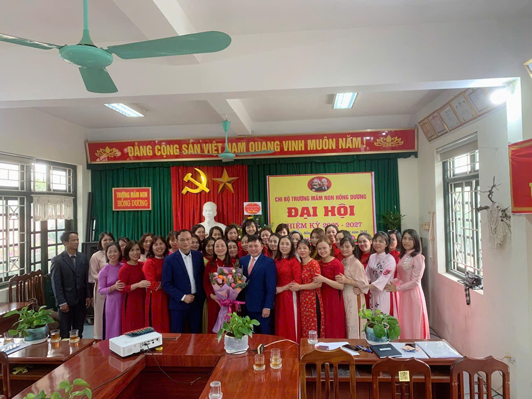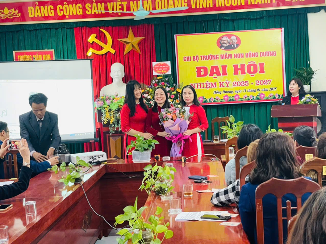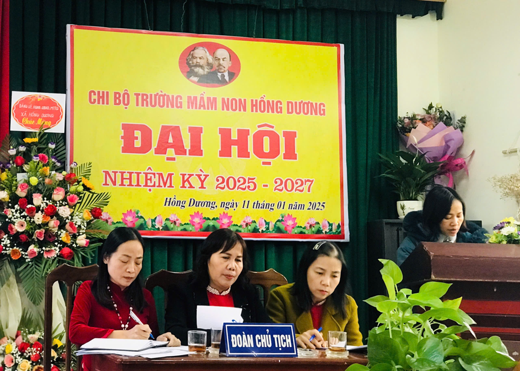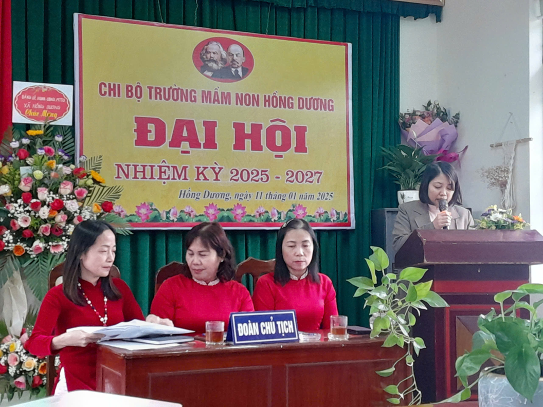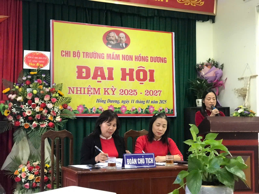 🌹🌹Về dự và chỉ đạo Đại hội, Chi bộ MN Hồng Dương vinh dự được đón tiếp Đ/c Đỗ Lương Thực - Phó Bí thư Thường trực Đảng ủy xã Hồng Dương; Đ/c Đỗ Xuân Minh- Phó chủ tịch hội đồng xã Hồng Dương; Các đ/c là đại diện các đoàn thể của nhà trường và toàn thể Đảng viên, quần chúng ưu tú của chi bộ. 🌹🌹Chương trình Đại hội diễn ra theo đúng quy trình: 🌹🌹Đại hội đã tiến hành báo cáo kết quả thực hiện nghị quyết Đại hội Chi bộ nhiệm kỳ 2022-2025, kiểm điểm sự lãnh đạo của chi ủy nhiệm kỳ 2022- 2025, phương hướng nhiệm vụ nhiệm kỳ 2025-2027. 🌹🌹Đại hội cũng đã được nghe 02 bản tham luận và nghe những lời phát biểu chỉ đạo của các đc lãnh đạo Đảng ủy xã Hồng Dương. 🌹🌹Đại hội đã tiến hành bầu Ban chi uỷ, Bí thư, Phó Bí thư và đại biểu dự Đại hội Đảng bộ xã Hồng Dương nhiệm kỳ 2025-2030 🎉🎉🎉Đại hội Chi bộ trường MN Hồng Dương đã diễn ra thành công tốt đẹp. Chi bộ nhà trường xin hứa sẽ luôn gương mẫu đi đầu, thực hiện thắng lợi Nghị quyết Đại hội, đưa Chi bộ trường MN Hồng Dương phát triển ngày càng vững mạnh.🌸🌸