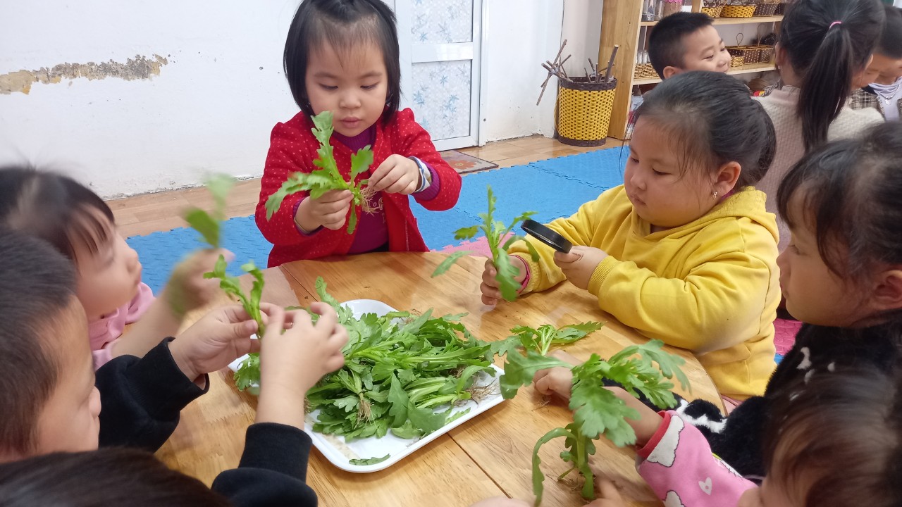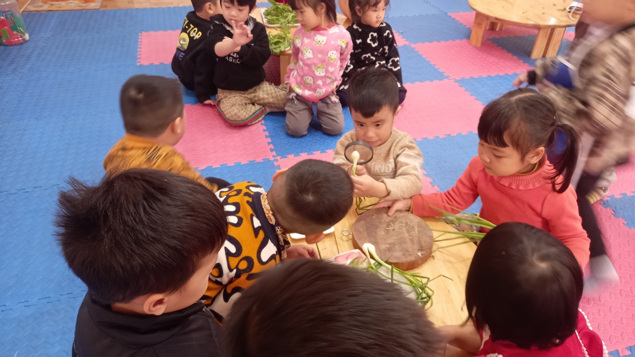 Hôm nay, ngày 4 tháng 1 năm 2023, các con lớp 4 tuôi B2 được khám phá về rau cải và hành. Trước giờ khám phá, các ô đã chuẩn bị cho các con rau cải, rau cải cúc, hành, các con được chia về các nhóm, các con được nhặt rau, thái rau. nhặt hành, thái hành. Các con được sử dụng dao dưới sự quan sát và giúp đỡ của cô Nguyễn Nguyệt Phương và cô Nguyễn Thị Thi. Các con được sử dụng kính lúp để soi, sau khi khám phá, các con cùng nhau dọn vệ sinh, quét và hót vào thúng rác và rửa tay bằng xà phòng.