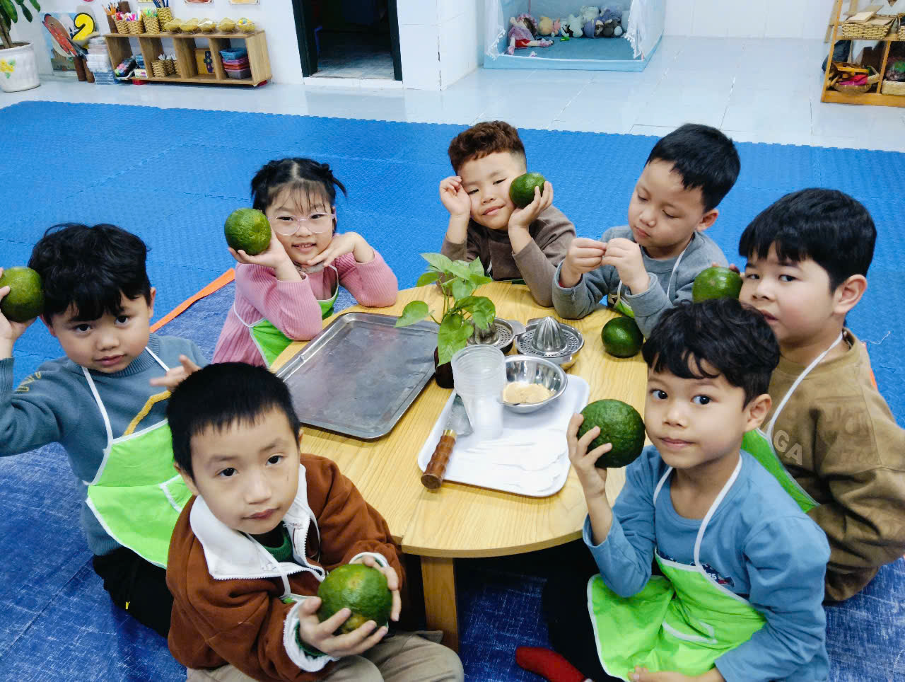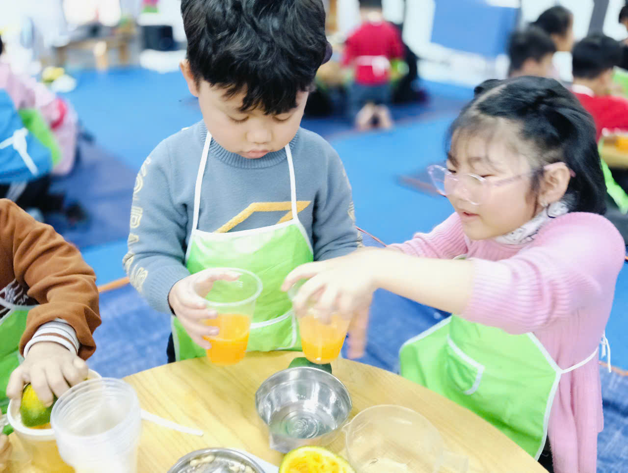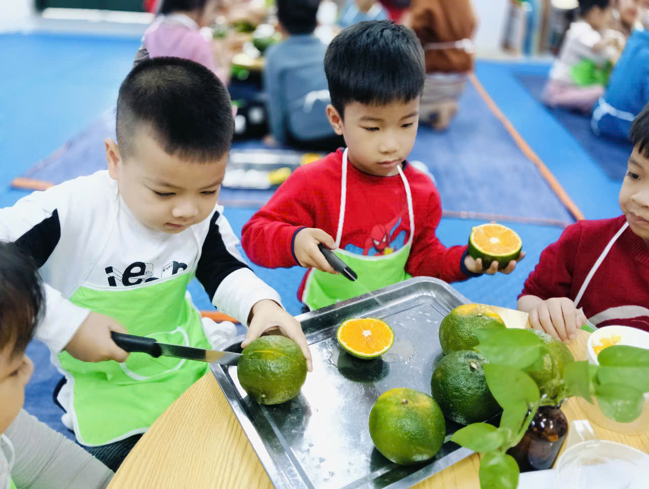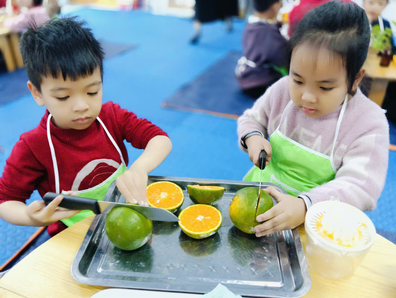 🌻 Trẻ được cô hướng dẫn cụ thể từng kỹ năng cầm, xoay để vắt cam sao cho ra hết nước trong miếng cam và cùng thưởng thức cốc nước cam thơm ngon bổ dưỡng.