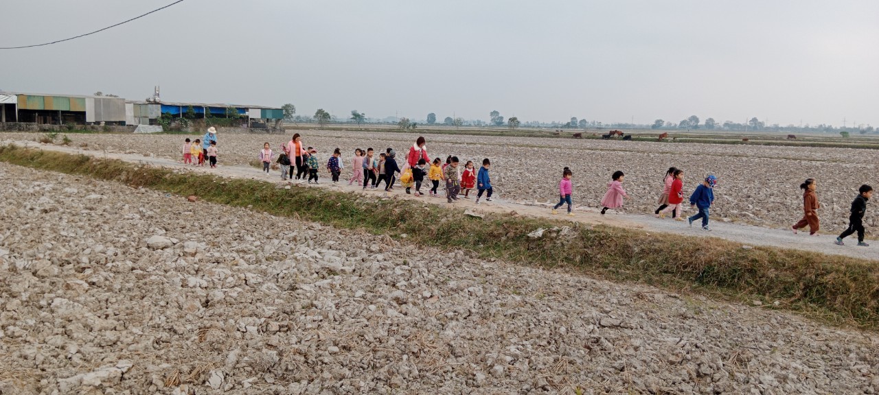 Hình ảnh các con đang bước trên con đường qua cánh đồng làng