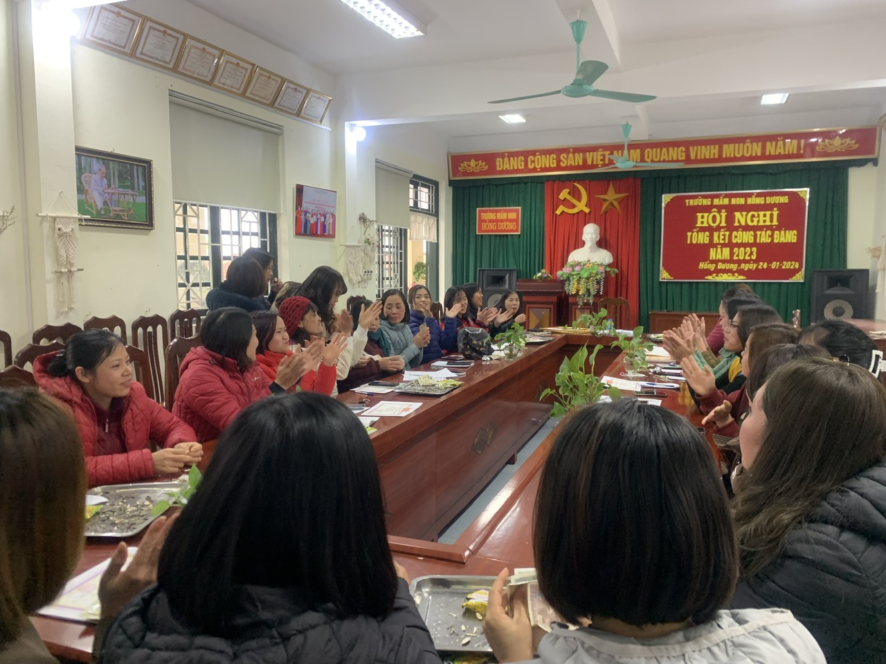 Chiều ngày 24/1/2024 sau hội nghị sơ kết học kỳ I, chi bộ tổ chức tổng kết công tác đảng năm 2023, đề ra phương hướng nhiệm vụ năm 2024. Tham dự hội nghị có 33/35 đảng viên. Hội nghị được nghe đ/c Bí thư chi bộ Nguyễn Thị Bích Hoà đánh giá kết quả đạt đuwocj và những hạn chế của chi bộ năm 2023, đồng thời đề phương hướng nhiệm vụ năm 2024. Hội nghị được nghe thảo luận của các đảng viên trong chi bộ, 100% đảng viên đồng tình nhất trí với báo cáo kết quả đạt được và những phương hướng của năm 2024.