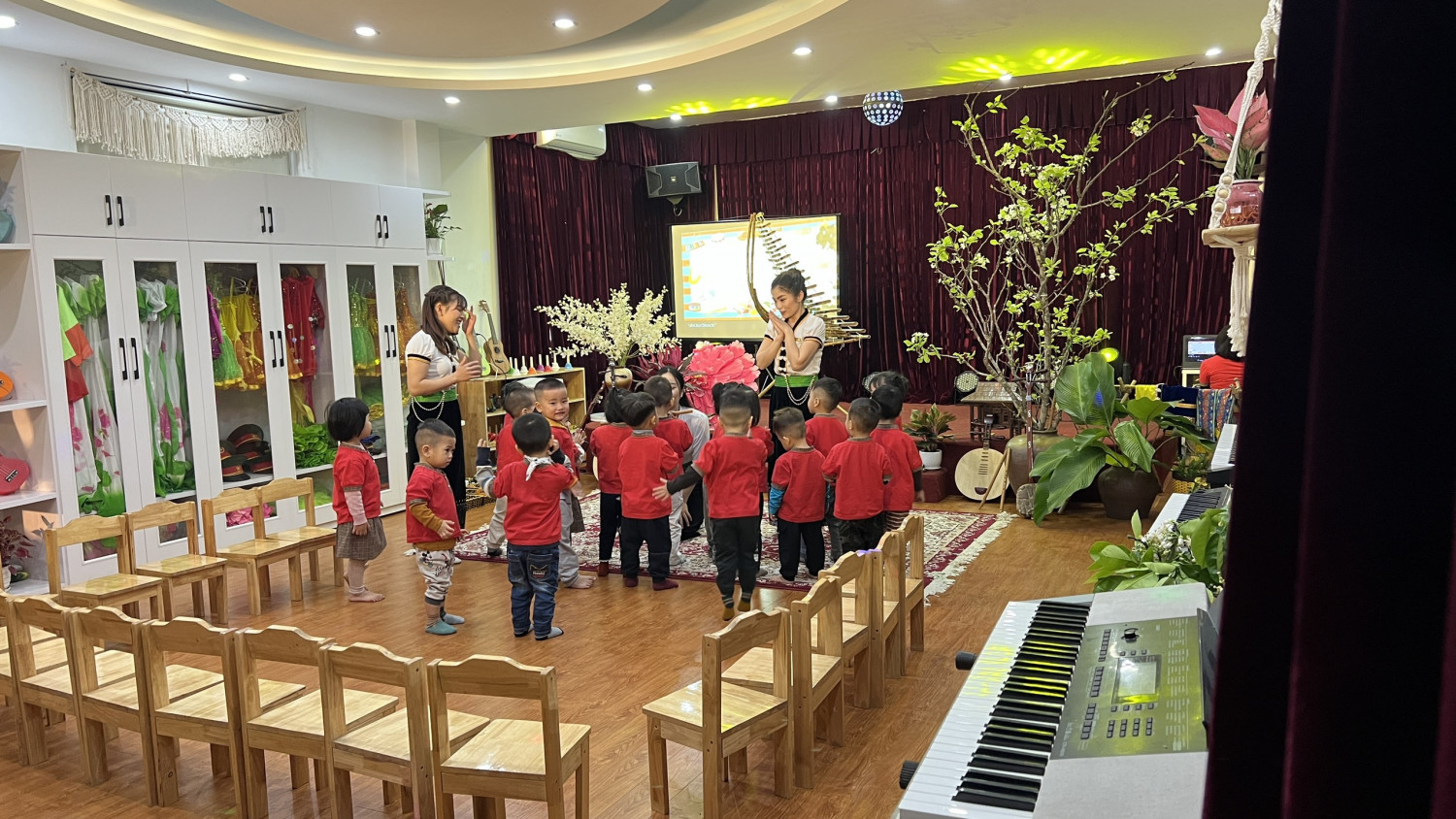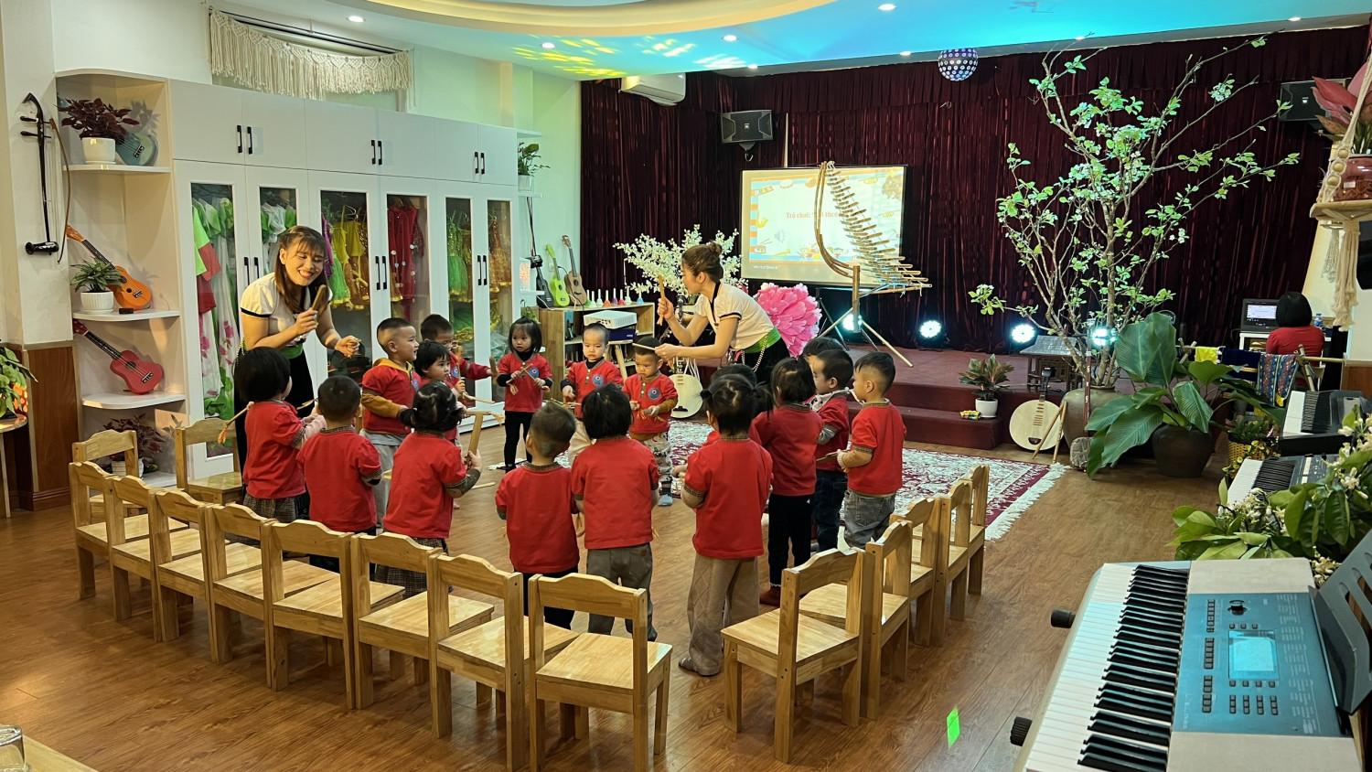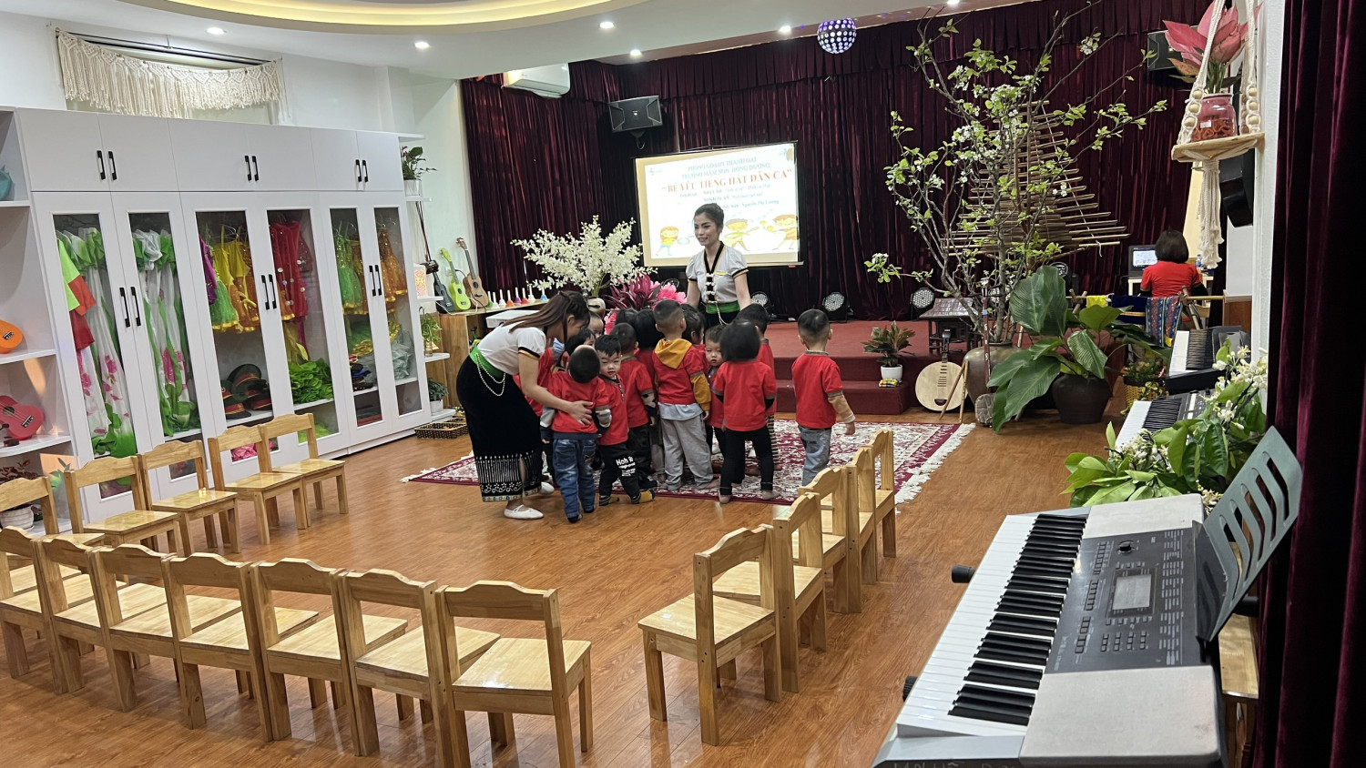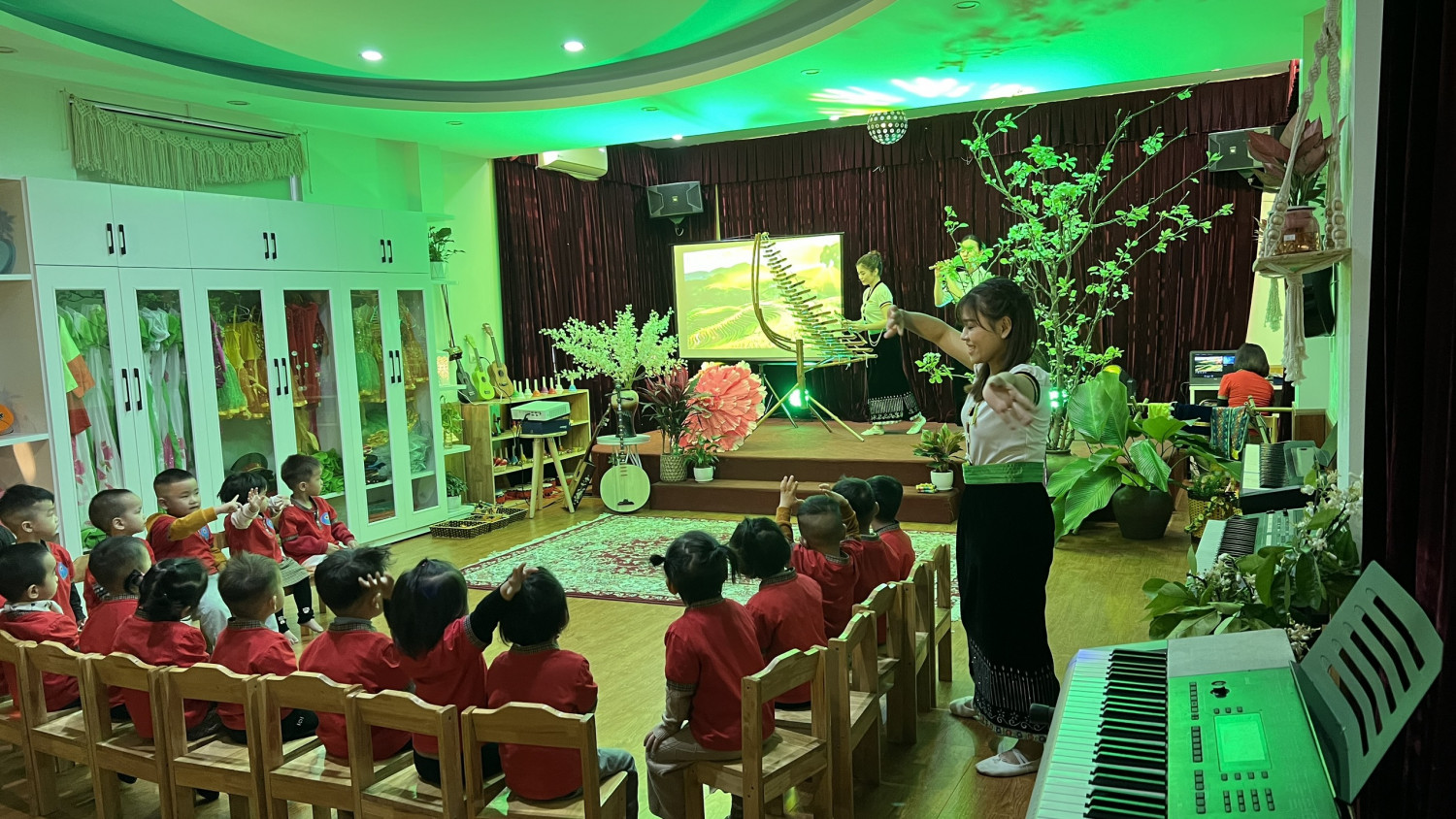 Tại Hội thi cô và trò rất hào hứng và sôi động.  Cô gần gũi thân thiện với trẻ, múa dẻo, hát hay kết hợp các nhạc cụ dân tộc rất phù hợp đã giúp trẻ biết những âm thanh, tiếng động , phong cảnh mùa xuân  của núi rừng Tây Bắc. Phần Nội dung kết hợp trò chơi gõ theo tiết tấu trẻ  lắng nghe âm nhạc và làm theo động tác giống cô.
