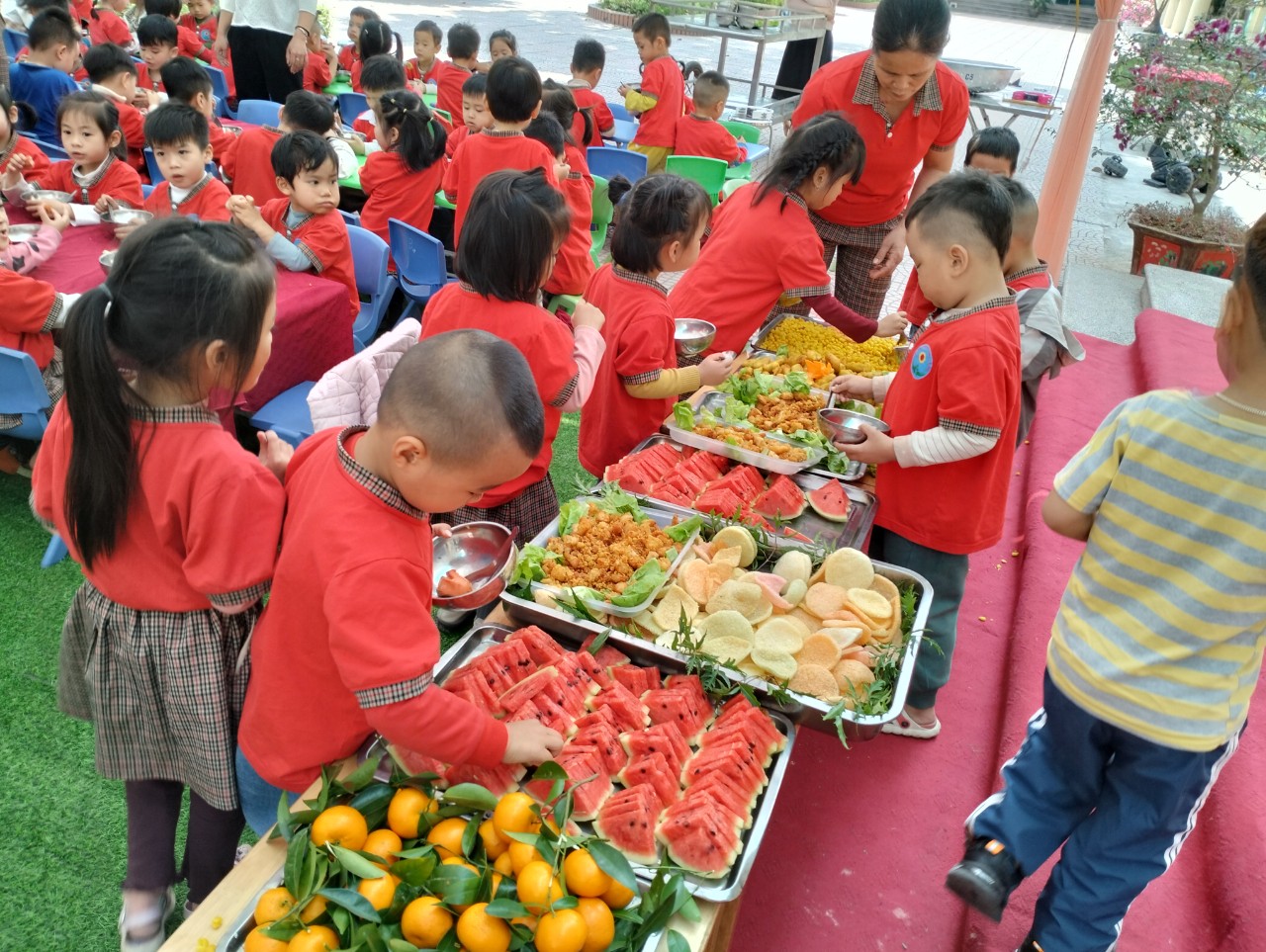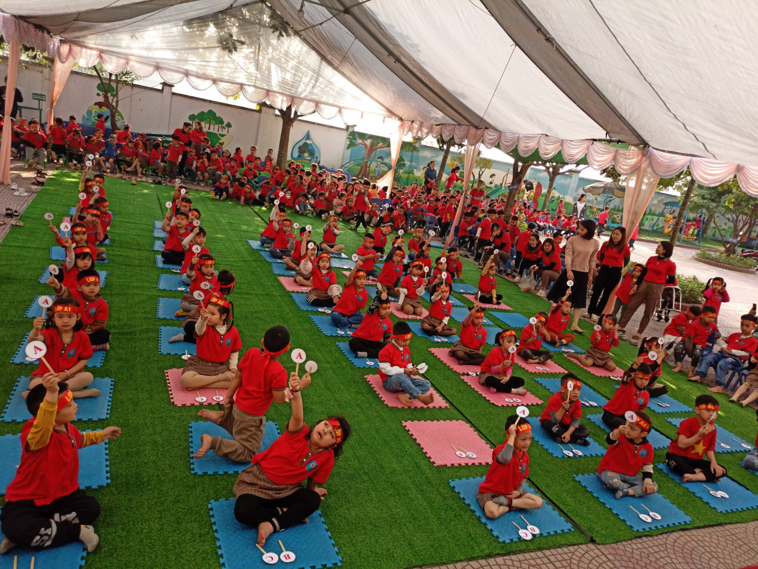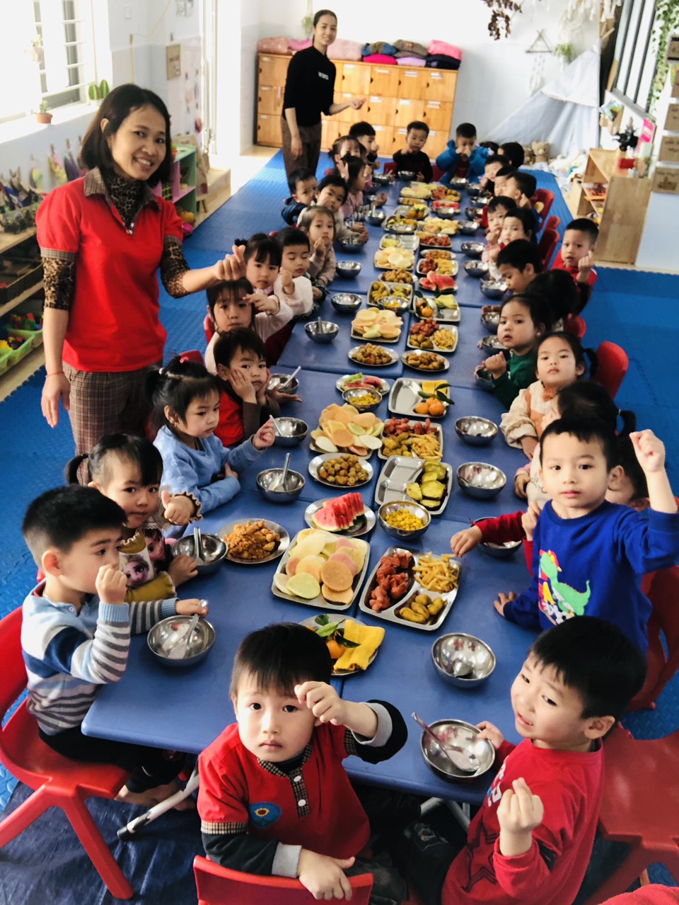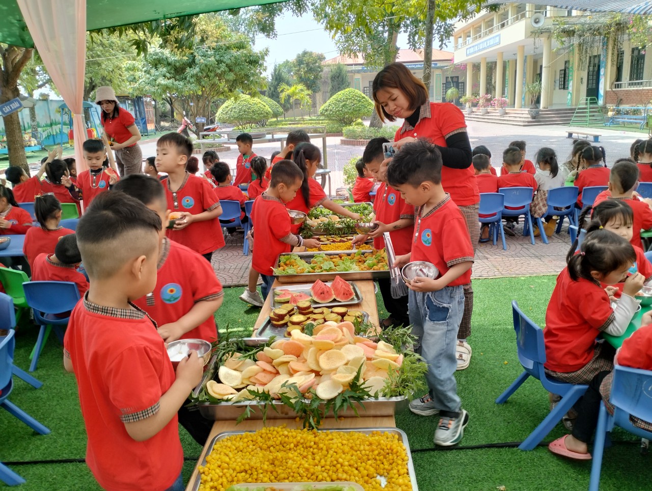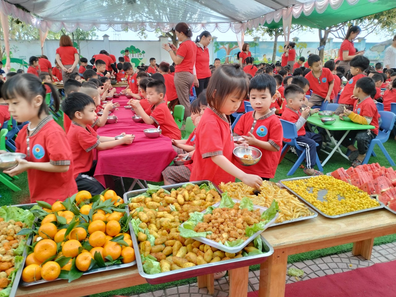 Sau phần tổng kết trao thưởng khối lớp 4 tuổi và 5 tuổi. Trẻ toàn trường ăn buffet tại sân trường.