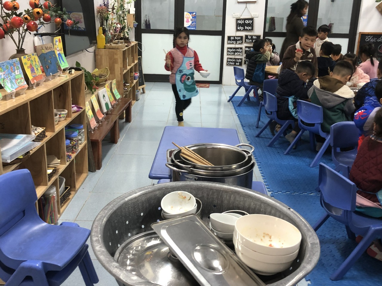 👉Bữa ăn công sở: Đây là một bữa ăn mà trẻ vô cùng thích thú và luôn mong đợi vì cơm, canh, thức ăn, tráng miệng được để gọn gàng trong khay inox có dạng hình chữ nhật rất gọn gàng,thuận tiện, dễ sử dụng với trẻ. Đây cũng là những biện pháp giúp trẻ có thêm các kỹ năng tự phục vụ bản thân, các thói quen cũng như hành vi văn minh của trẻ. Cùng theo dõi giờ ăn bằng khay của các bé lớp 5 tuổi A5 nhé . ❤️❤️❤️❤️