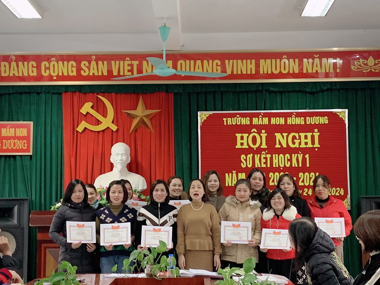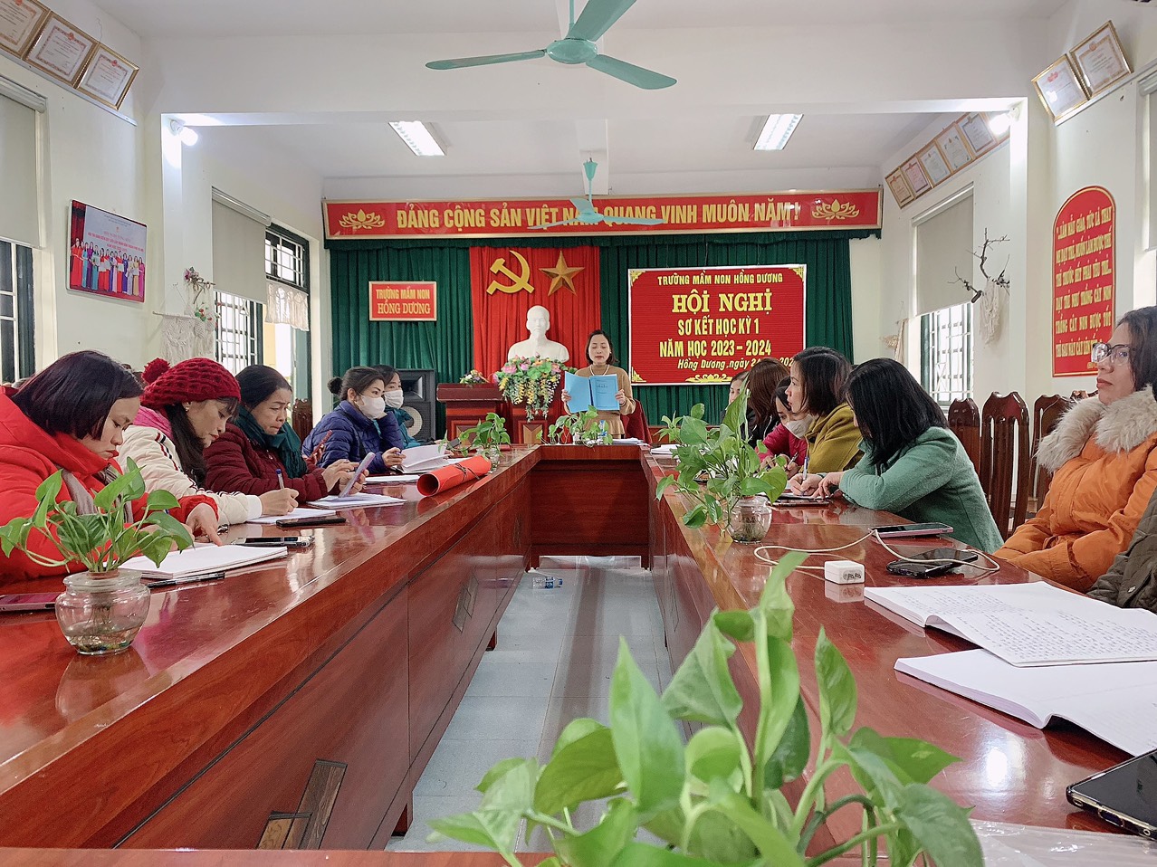 Phần I: Đồng chí Hiệu trưởng Nguyễn Thị Bích Hoà thông qua những kết quả đạt được trong công tác chăm sóc và giáo dục học kỳ I, triển khai phương hướng, nhiệm vụ trọng tâm học kỳ II. Trong báo cáo nêu cụ thể các thành tích đạt được do tập thể và cá nhân trong đội ngũ GV, NV nhà trường, sau đó là ý kiến của các đồng chí CBGV, NV. 100% CBGV, NV đồng tình với nội dung trong báo cáo sơ kết mà đ/c HT vừa thông qua.