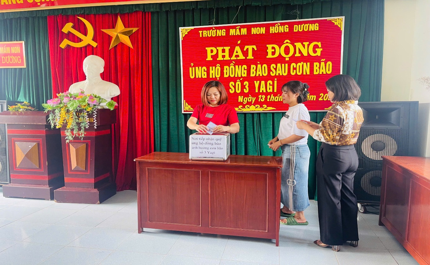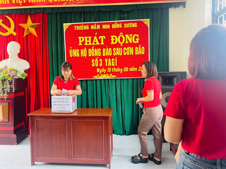 Cán bộ, giáo viên, nhân viên Trường Mầm non Hồng Dương trong buổi phát động ủng hộ đồng bào bị miền Bác bị thiên tai.